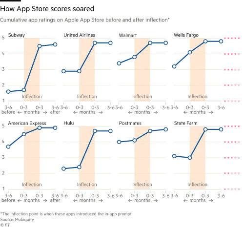 从某种意义上说,这是一个巨大的成功。用户评分的参与度飙升。根据Apptentive的数据,平均每个应用程序的评分从2017年的1.9万次上升到2019年的逾10万次。相比之下,谷歌应用商店在这段时间内并未提供应用内评分,单个应用的评分仅从3.3万次上升到4.3万次。