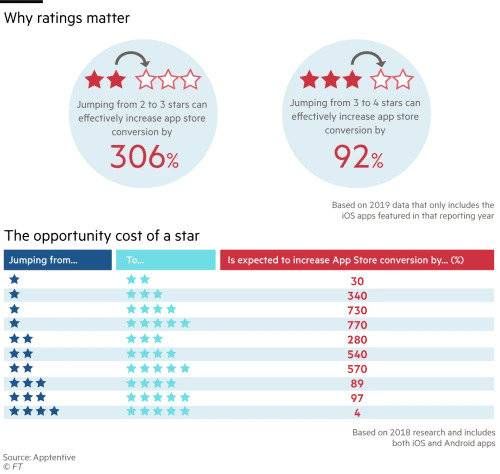 应用程序之间的竞争非常激烈,因此获得高分至关重要。应用评价管理公司Apptentive将应用评级称为“移动应用世界的命脉”。该公司的研究显示,从2星跳到3星可以使下载量增加306%,而从3星升至4星则能使下载量增加92%。为企业应用商店排名优化服务的Gummicube表示,五分之四的用户不信任评级低于4星的应用。