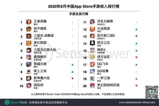 本期榜单与上期相比变化不大,《三国志幻想大陆》,《最强蜗牛》,《新神魔大陆》和《放开那三国3》等新游稳居中国手游市场头部;《穿越火线》,《明日之后》和《一梦江湖》重回榜单,以下是8月中国App Store手游收入Top20。