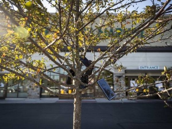 在芝加哥郊区,彭博社记者发现了这样一个奇怪的现象:亚马逊快递站和全食超市附近的树上挂满了手机。