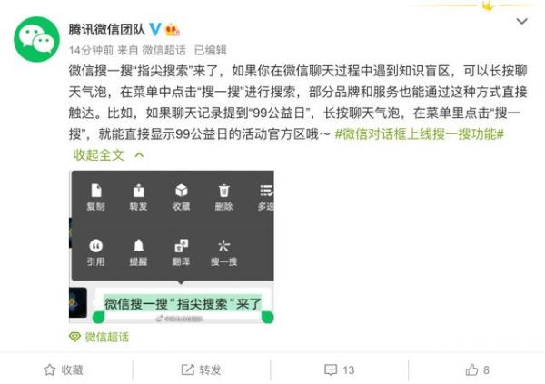 腾讯微信团队官方微博9日消息,微信搜一搜推出“指尖搜索”功能。微信称如果在微信聊天过程中遇到知识盲区,可以长按聊天气泡,在菜单中点击“搜一搜”进行搜索,部分品牌和服务也能通过这种方式直接触达。