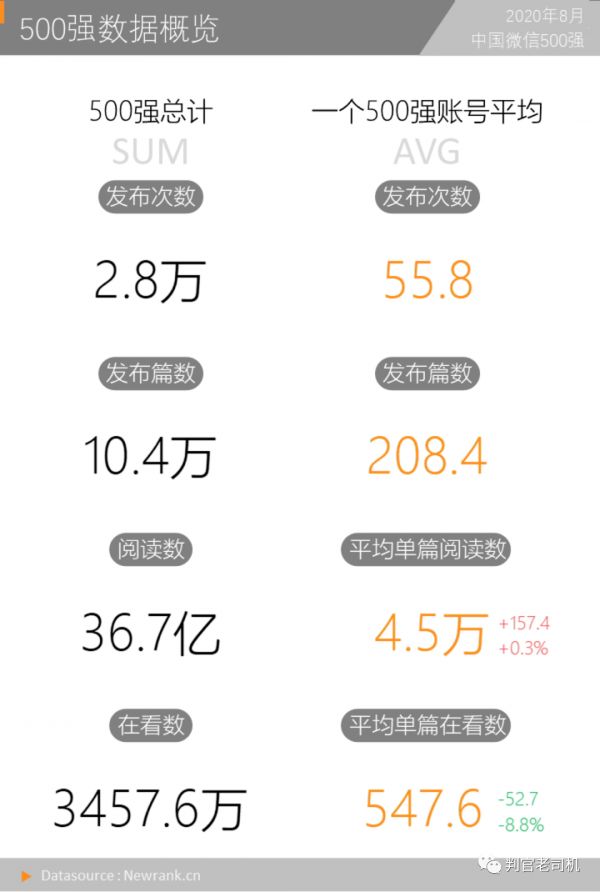 根据新榜发布的《中国微信500强月报(2020.08)》,500个微信公众号头部账号,平均每篇推文约能收获45321.36次阅读(环比增加0.3%),和547.6次“在看”(环比下降8.8%)。平均单篇在看数,自今年3月份以来,已连续下降6个月。