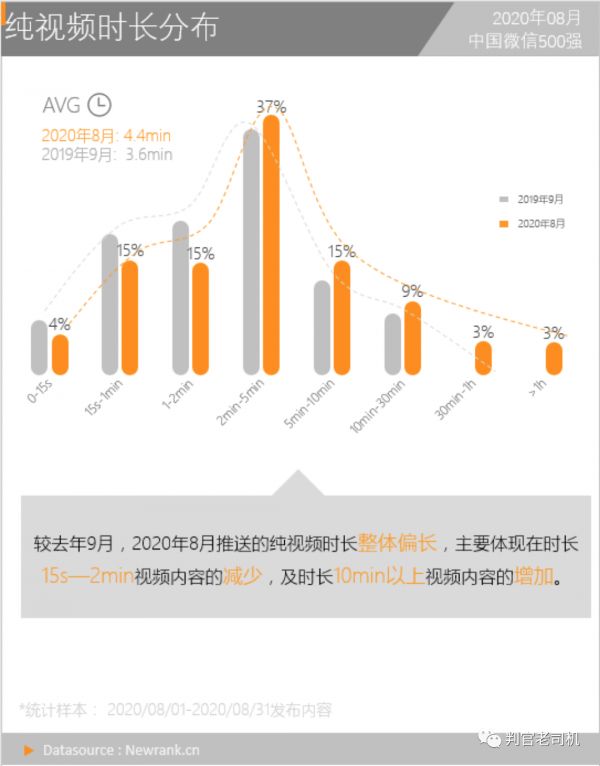 新榜《中国微信500强月报(2020.08)》显示,今年8月,新榜监测公众号样本中使用视频功能的账号已达到6.7%,该比例是2019年9月(2.5%)的 2.7倍。纯视频内容占全样本内容的占比也呈现大幅增长趋势,由2019年9月的0.4%攀升8.8倍,至今年8月已高达3.5%。