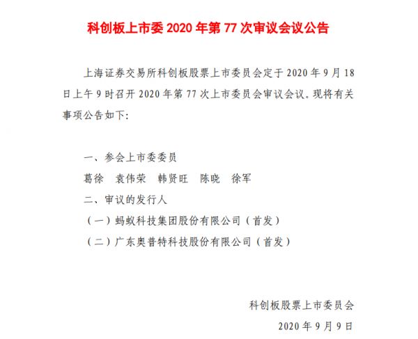 9月9日晚,科创板上市委会议公告显示,委员会将于9月18日上午审议蚂蚁科技集团股份有限公司首发。同时,上交所科创板官网发布蚂蚁科技集团招股书。