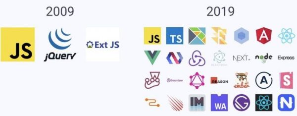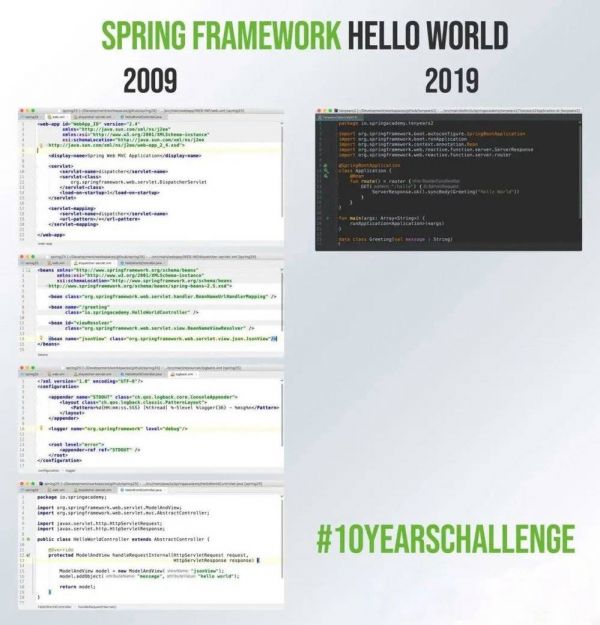 2009年,Spring需要若干XML配置和Java文件,而2019年只需要一个Java/Kotlin文件就可以。十年前前端只有Plain Old Javascript、jQuery、ExtJS可选,而如今就有二十多个选项。