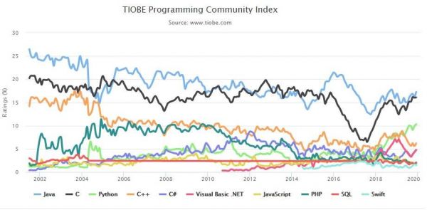 2002 年到 2020 年编程语言趋势图. 图片来自:TIOBE
