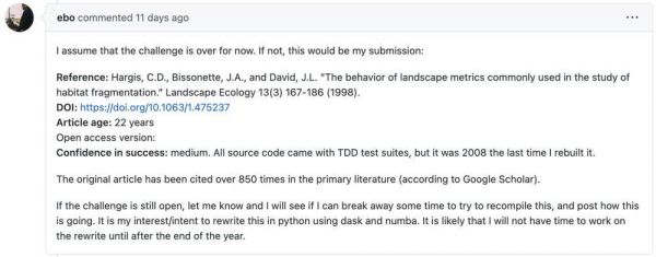 比如第一个参与人 John(EBo)David 提交的代码,写于 22 年前,名为“The behavior of landscape metrics commonly used in the study of habitat fragmentation”(常用于生境破碎化研究的景观度量的行为)。