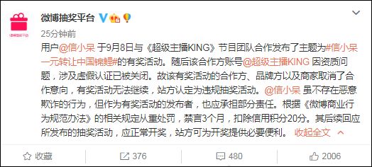 (观察者网讯)微博抽奖平台官方账号(@微博抽奖平台 )9日发布消息称,用户@信小呆 于9月8日与《超级主播KING》节目团队合作发布了主题为“信小呆一元转让中国锦鲤”的有奖活动。随后该合作方账号@超级主播KING因资质问题,涉及虚假认证已被关闭。故该有奖活动的合作方、品牌方以及商家取消了合作意向,有奖活动无法继续,站方认定为违规抽奖活动。@信小呆 虽不存在恶意欺诈的行为,但作为有奖活动的发布者,也应承担部分责任。根据《微博商业行为规范办法》的相关规定从重处罚,禁言3个月,扣除信用积分20分。其后续回应所发布的抽奖活动,应正常开奖,站方可为开奖提供必要便利。