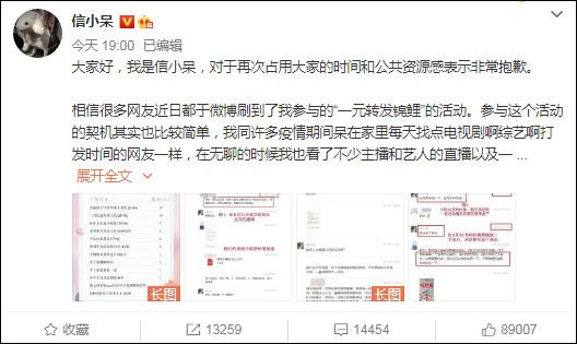 9日下午,“信小呆”发布微博向网友道歉,称自己是在一时兴起之下参加的活动,并没有过多深究活动的细则,就接受了活动方的邀请并参与了推广活动。然而在配合活动方宣传的时候,才意识到这个活动的确有着大量的问题同时也并没有相关的资质,而她自己的不严谨与大意却又进一步扩大了事件,让事情发酵的越来越大。