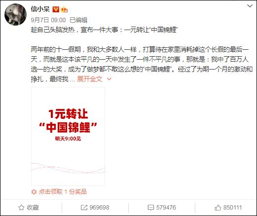 9月7日,“信小呆”宣布决定将“中国锦鲤”这个改变她命运的身份,1元转让给下一个幸运的人,希望他(她)能够将这份幸运一直传递下去,而她这个“后浪”,则要去开启新的事业,面对全新的人生和全新的挑战。
