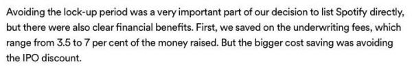 Spotify的首席财务官Barry Mccarthy事后曾在《金融时报》撰文披露,Spotify为什么选择DPO而不是IPO,其中一点是:省下3.5%—7%的承销费。