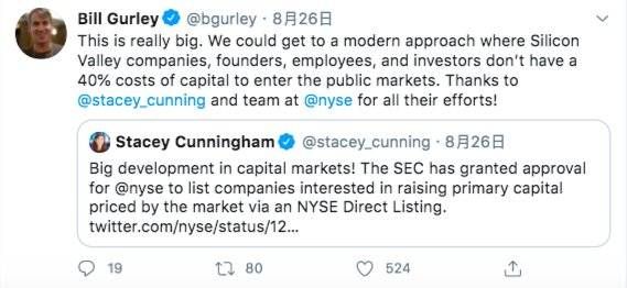 Bill Gurley本人对这一新规发推表示:动作确实很大,这是以一种更现代的方式帮助硅谷的公司、创始人、员工乃至投资人无需以40%的资本代价,进入公开市场。