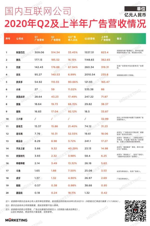 2020年Q2中国20大互联网公司广告收入情况梳理