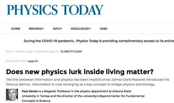 这两者碰撞出的火花预示着一个新的科学前沿,在这里,现在被正式理解为是一个物理量——或者说是一组量的信息占据了中心位置,从而将用于统一物理学和生物学[2]。