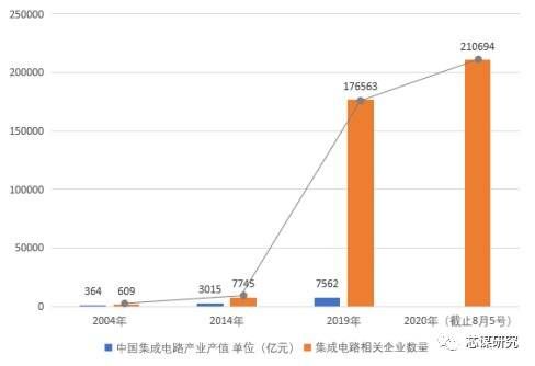 君不见,从2004年到2020年,中国集成电路产业产值增加了20倍,与之对应的集成电路相关企业数量却暴增300余倍——相当于每增加一倍的产值,就会增加十五倍的企业数量。