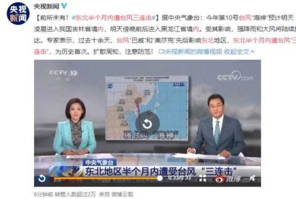 据中央气象台消息:从8月27日起,今年第8号台风“巴威”、第9号台风“美莎克”、第10号台风“海神”相继影响东北地区。半个月内,三个台风接连“造访”东北地区,为历史首次,受到公众的高度关注。