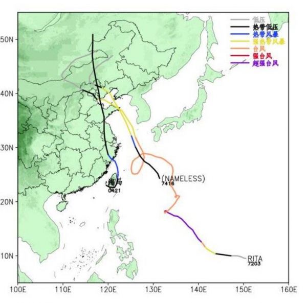 据统计,从1949年至2019年,进入东北地区的台风有40个。其中2014年第21号台风“海马”、1974年第16号台风、1972年第3号台风Rita都是一路北上且到达了较北位置。