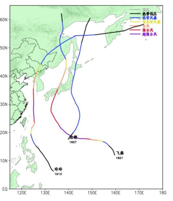 将范围扩大到西北太平洋范围,北上纬度超过北纬49.5度的台风达114个。