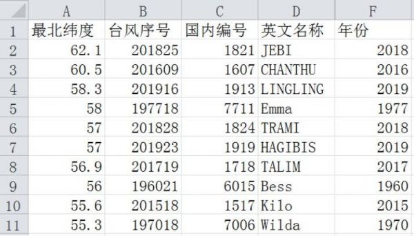其中,排名第一的是2018年第21号台风“飞燕”,纬度达北纬62.1度,深入俄罗斯地区。排名第二的是2016年第7号台风“灿都”,纬度达北纬60.5度。排名第三的是2019年第13号台风“玲玲”,纬度达北纬58.3度。