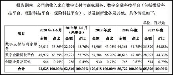 蚂蚁集团旗下各业务营收占比情况,来源:蚂蚁集团招股书