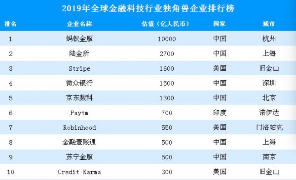 2019全球金融科技行业独角兽前十 数据来源:胡润研究院,中商产业研究院整理