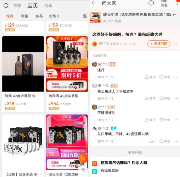 而在评价方面,“随我小酒”的评价较好,但是绝大部分的评价都集中在去年,也就是随我小酒刚开始推广的那段时间,而近段时间其他用户对商品的问答都是寥寥无几。