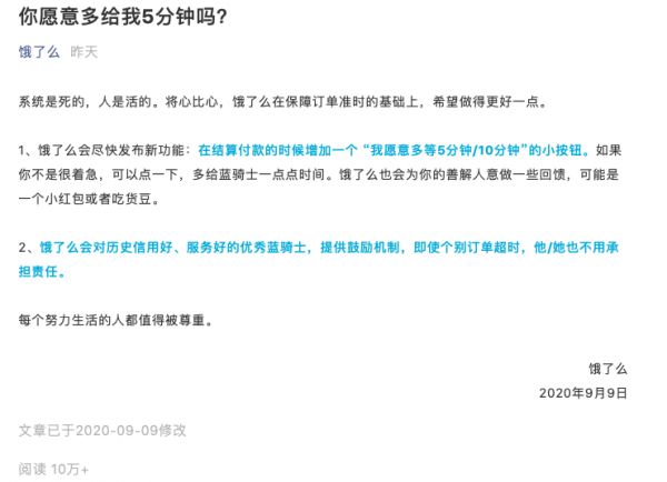 饿了么第一时间回应,让用户可以在结算付款时增加“我愿意多等5分钟/10分钟”的小按钮,同时会对历史信用好、服务好的“蓝骑士”提供鼓励机制,允许其个别订单超时。饿了么的解决方案给用户提供了一个“我愿意”的选项,虽然最终选择权在用户,却依然被一些人指责是“道德绑架”,点外卖时,我究竟是选还是不选呢?