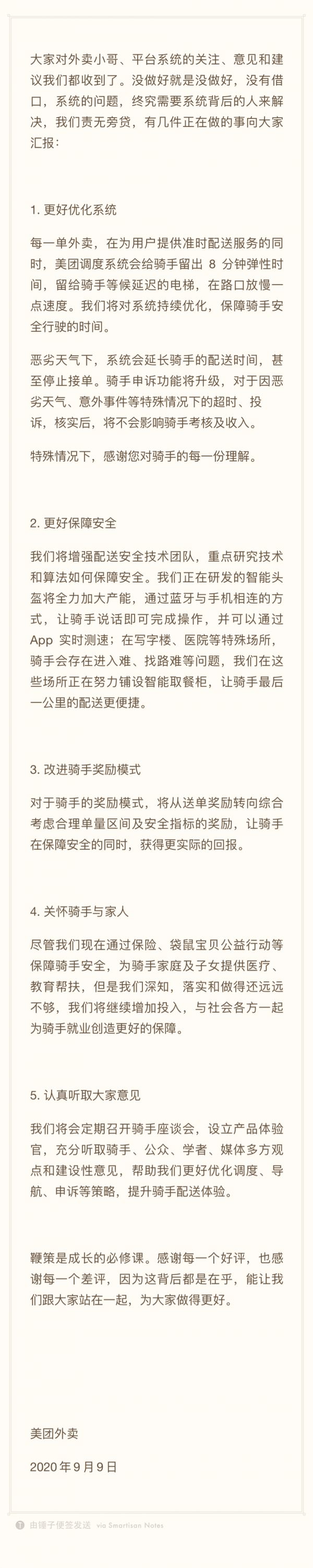 美团外卖时隔一天多后才给出回应,虽然没有掌握先机,但反而基于饿了么回应后的舆情反馈,给出了一份更加周密详细的方案,主体思路是优化系统给骑手8分钟弹性时间、考虑恶劣天气等特殊情况给予申诉入口,改进外卖骑手奖励手段,利用智能头盔、智能取餐柜等技术来优化骑手的工作环境。在社交网络上,美团外卖这份回应得到的肯定还是不少的。