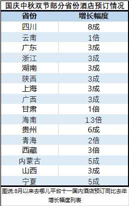 与往年不同,国庆热门目的地从沿海向西南、西北两个方向发展。截至9月10日,西藏、青海、海南、甘肃和云南成为去哪儿平台,十一假期酒店预订量同比增幅最高的五个省份(自治区)。