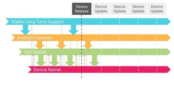 在当前的安卓系统中,Linux 系统内核升级大体需要经历三个步骤。首先,Google 选定一个 Linux LTS 版本作为安卓内核,打上安卓运行所需要的 Patch;接着,Google 将这个内核提交给高通等 SoC 供应商,供应商再次将其打造成为适配 SoC 的内核;最后,三星等设备商再让内核适配不同的元器件,再次为内核打上各种 Patch,让内核成为真正可以在安卓机上运行的版本。