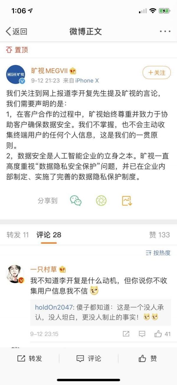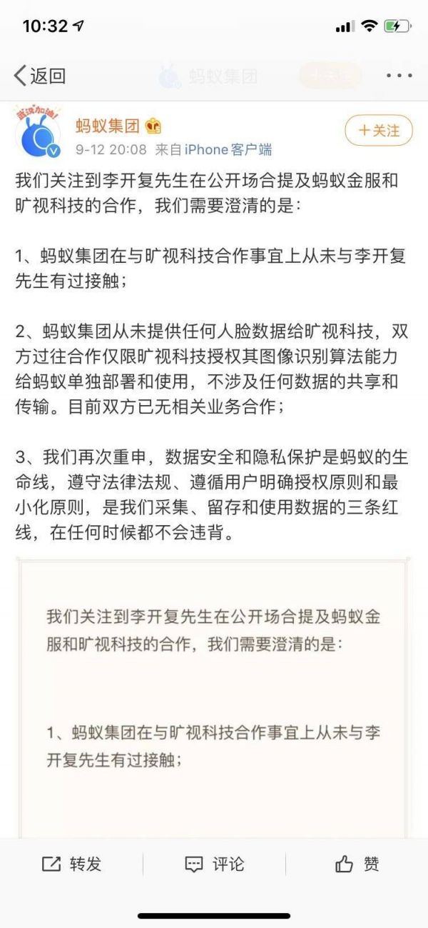 要知道,在蚂蚁金服发公告澄清“李开复先生的演讲并不属实,自己从未向旷视提供人脸识别数据”(下图)被送上微博热搜之前,我们完全不知道原来李开复老师参加了一个创业者大会,并发表了一些跟数据应用相关的言论。