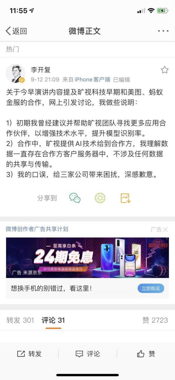 李开复在蚂蚁金服澄清事实发布的致歉声明