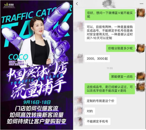 随后,记者表示需要做一个财经活动的微博蓝V账号,对方回复说可以定制,需要7天左右,费用为6000元,做好后可以绑定手机,营业执照由对方负责。