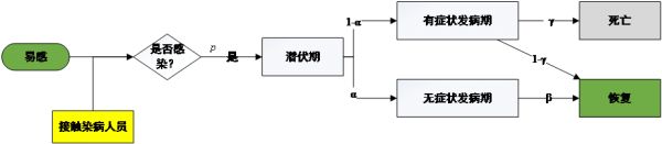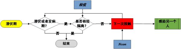 图2则显示了病毒携带者如何感染他人,如果一个人处于潜伏期或患病期(包括无症状或有症状的状态)并且没有被隔离,则与另一个人的每次接触都可能导致感染。一个人是否被隔离既受检测结果的影响,也受他与确诊患者的接触的影响。“星策演疫”正是利用这样的疾病传播模型推演计算疫情发展情况。