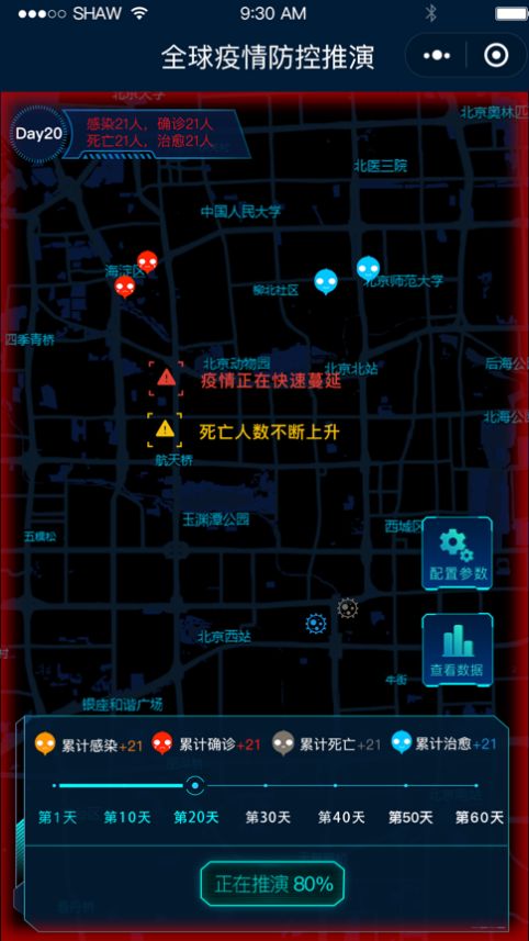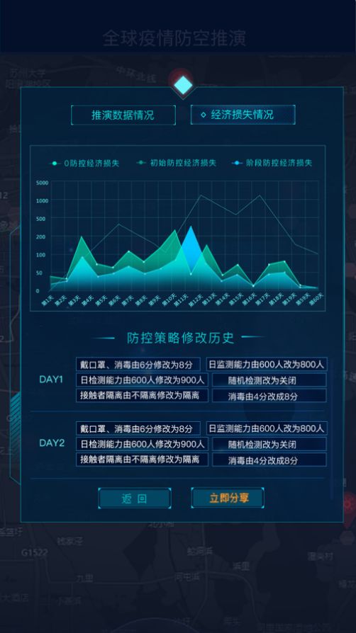 配置完成后,用户点击“开始推演”即可在地图上直观看到确诊人数、感染人数、死亡人数和治愈人数的变化情况,最终可生成推演结果报告,展示不同防控策略下疫情变化曲线图和经济影响情况。