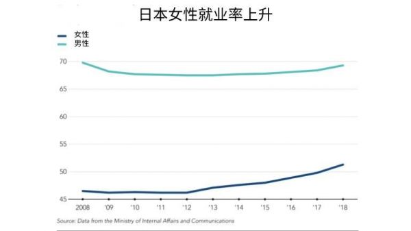 在这项政策的影响下,2018年,日本全部年龄段的女性的就业率达到51.3%,时隔50年首次超过50%。女性劳动年龄人口(15~64岁)的就业率达到71.3%,超过了美国。