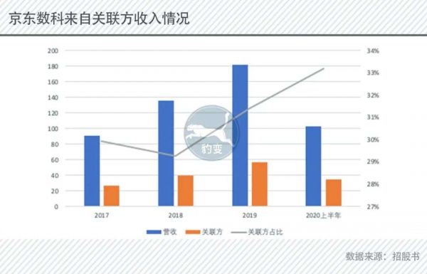 招股书数据显示,从2017年到2020年上半年,京东数科的收入有三成来自京东及其关联方,并且有上升趋势。