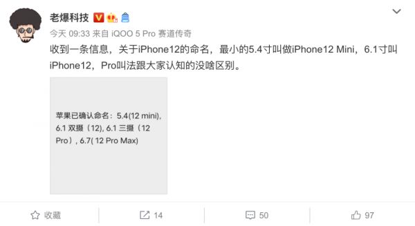 日前,数码博主@老爆科技带来最新一条消息,表示iPhone 12系列的命名方式已经确定,和之前爆料不同的是,5.4吋的“iPhone 12”的名称变成了“iPhone 12 mini”。如果消息为真的话,这应该是首款以mini命名的苹果手机。至此,iPhone名称中已经包含Plus、mini、Pro、Max。