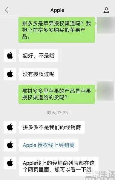 可在另一边消费者也不难发现,苹果方面实际上早已发出消费提醒,“拼多多没有苹果的授权店铺,无法保证是正品,建议在官方渠道购买”。事实上翻阅苹果授权线上经销商的名单列表就可以看到,至今拼多多依然不在官方认可的范畴内。