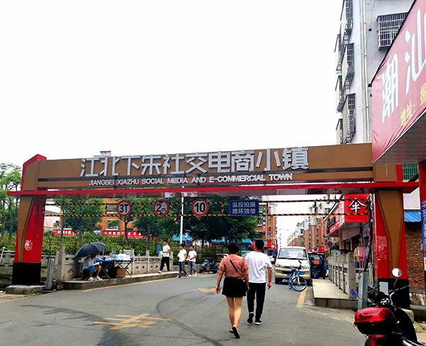 在楼春看来,这源于江北下朱近些年的积累,楼春向澎湃新闻记者介绍,借助一路之隔的货运市场,江北下朱起初吸引了大量物流行业的进驻,但大货车进村有不少安全隐患,后陆续搬出。2015年前后,部分江湖地摊、库存经营户来到村里,渐渐形成了商业气氛。2016年,因为物流便捷,商品价格低廉,江北下朱成了微商乐园。从2017年开始,微商走下坡路,江北下村开始产业升级,成了全国闻名的社交电商第一村。至今,村口还挂着“江北下朱社交电商小镇”的牌子。
