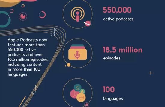 2018年6月苹果在全球开发者大会(WWDC)上表示播客(podcast)已超55万,已发布超过1850万期播客节目,覆盖上百种语言。