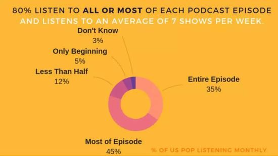 调查显示,80%的人会完整或者大部分听完播客节目,并且每周平均至少会听7种不同的节目。