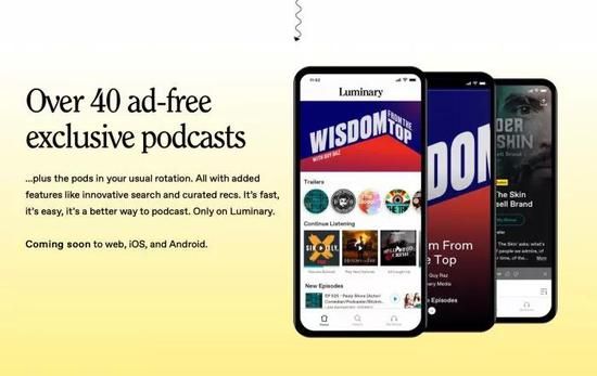 今年3月,誓当“播客界Netflix”的Luminary获得100万美元融资。每月8美元,无广告收听40多档高质量播客节目。其中节目制作人包括美国著名脱口秀主持人Malcolm Gladwell,演员Lena Dunham,音乐剧演员Patti LuPone等等。