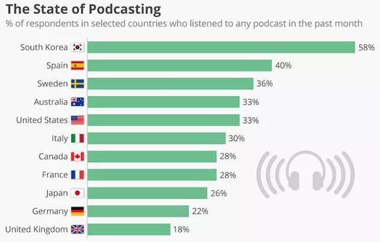 2018年,Reuters Institute发布的Digital News Report中指出,在来自全球22个国家的受访者中,超过三分之一的人在过去一个月中都听过播客节目。Business Insider Intelligence预测2023年全美播客用户将超1亿。