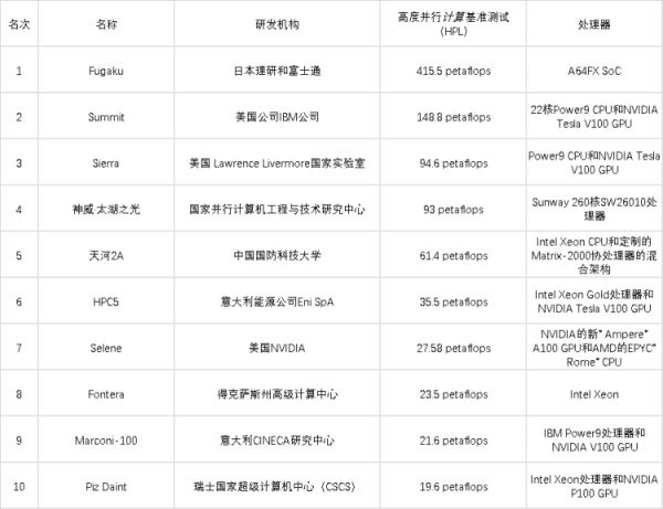 ▲ 2020 年 6 月公布的超级计算机 500 强榜单前十