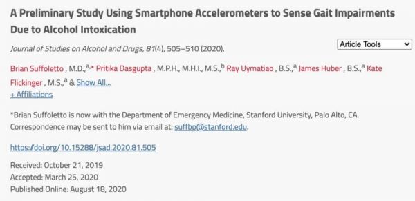 近日,他所带领的团队在《酒精与药物研究杂志》(“Journal of Studies on Alcohol and Drugs”)发表了最新研究“A Preliminary Study Using Smartphone Accelerometers to Sense Gait Impairments Due to Alcohol Intoxication”,介绍了使用智能手机检测是否醉酒的方法。