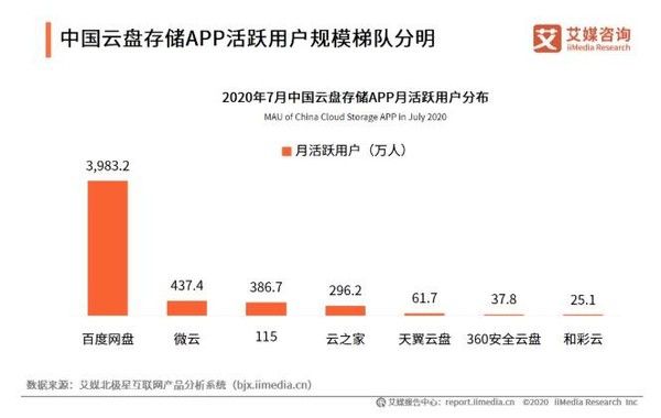 目前网盘市场是百度网盘一家独大的格局。根据艾媒咨询发布的报告显示,截止今年7月百度网盘拥有月活3983.2万人,位列行业第一。而排名第二、第三的腾讯微云以及115网盘,分别拥有437.4万和385.7万的月活,与百度相差甚远完全不是一个级别的存在。某种意义上来看,百度几乎可以说“垄断”了整个国内个人网盘市场。