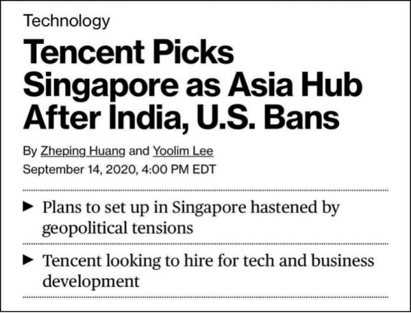 9月15日,据彭博社报道,腾讯已将新加坡选为亚洲中心,正计划将包括国际游戏发行在内的业务转出中国。