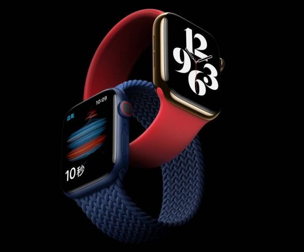 发布会的第一个新产品是Apple Watch Series 6 。它采用基于A13芯片研发的S6双核处理器,比前代提升性能20%,有40mm和44mm两种不同表盘尺寸的蜂窝版和Wi-Fi版可供选择。颜色方面则为红色、蓝色、墨色和新金色。