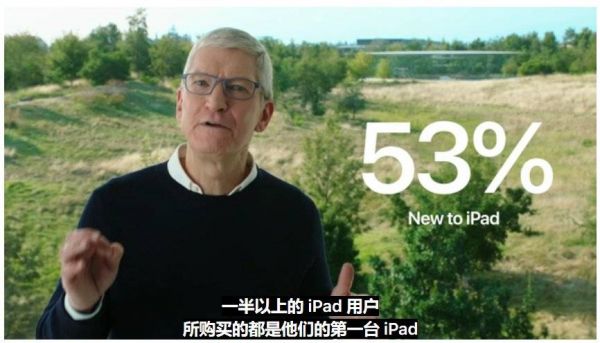 在新iPad发布环节前,库克分享了一个官方数据,称有53%的iPad用户所购买的都是他们的第一台iPad——苹果想说的是,iPad仍然有强劲的获客能力,能吸引来一批新鲜的非iPad用户。